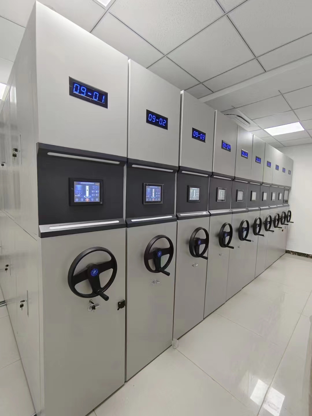 電腦多功能密集架具有操作到位時(shí)照明燈自動(dòng)開啟、關(guān)閉的功能,方便用戶現(xiàn)場(chǎng)查閱資料